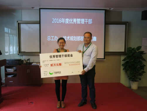 The second agenda was to award the 2016 annual advanced management cadres. Liu Xin, minister of technical planning department in Chief engineer office, won the honor with his  optimistic working attitude and outstanding performance. Wu Junshan, the leader of the company, issued the honorary certificate and a trophy to Liu Xin.