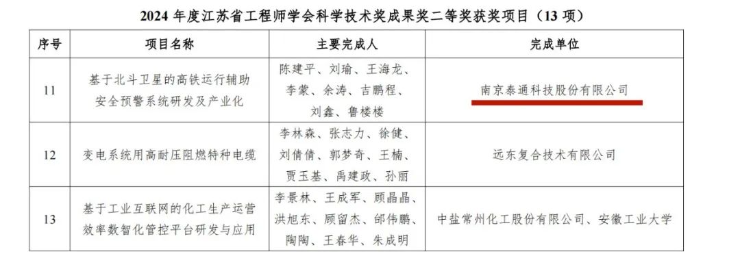 由泰通科技獨(dú)立完成的“基于北斗衛(wèi)星的高鐵運(yùn)行輔助安全預(yù)警系統(tǒng)研發(fā)及產(chǎn)業(yè)化”項(xiàng)目,經(jīng)過層層評審,從諸多申報(bào)項(xiàng)目中脫穎而出,榮獲“2024年度江蘇省工程師學(xué)會(huì)科學(xué)技術(shù)獎(jiǎng)成果獎(jiǎng)二等獎(jiǎng)”。