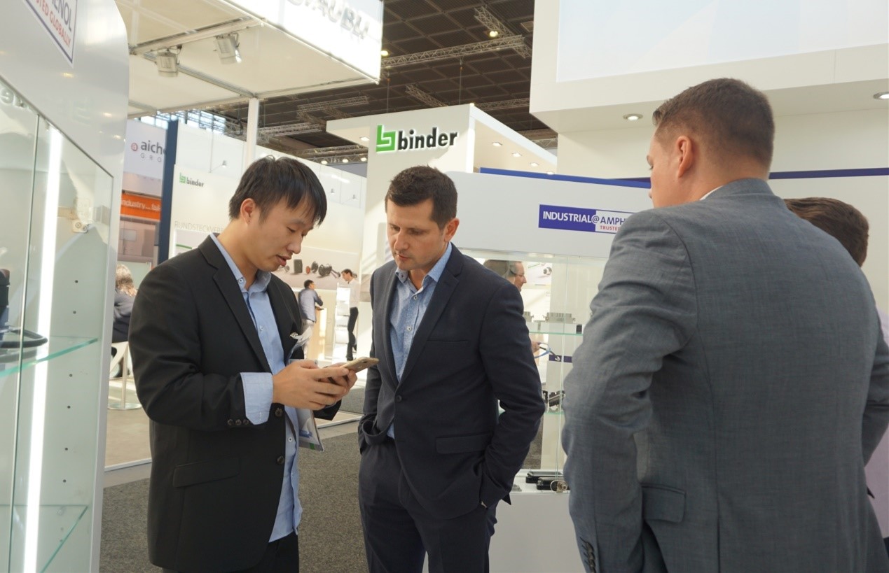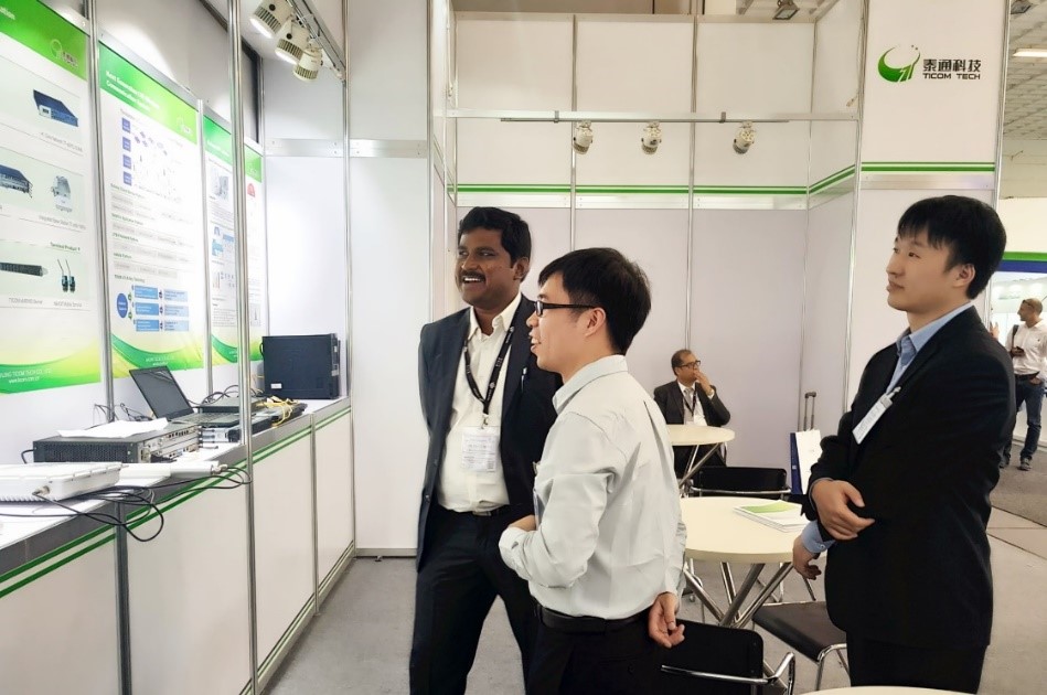 泰通科技董事長吉榮新、總工程師陳建平與行業(yè)其他展商洽談