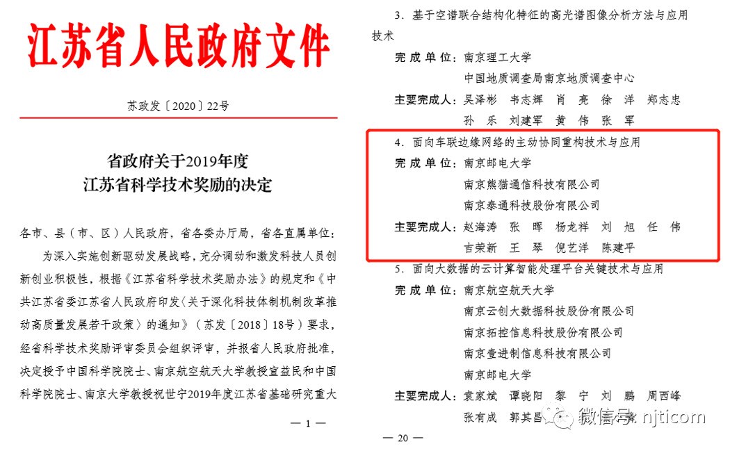 近日,江蘇省人民政府發(fā)布《關(guān)于2019年度江蘇省科學(xué)技術(shù)獎勵的決定》(蘇政發(fā)〔2020〕22號),泰通科技參與的“面向車聯(lián)邊緣網(wǎng)絡(luò)的主動協(xié)同重構(gòu)技術(shù)與應(yīng)用”項(xiàng)目獲得江蘇省2019年度科學(xué)技術(shù)獎二等獎,董事長吉榮新、總工程師陳建平為本項(xiàng)目的主要完成人,這是我公司首次在軌道交通與物聯(lián)網(wǎng)領(lǐng)域獲得的省部級二等獎。