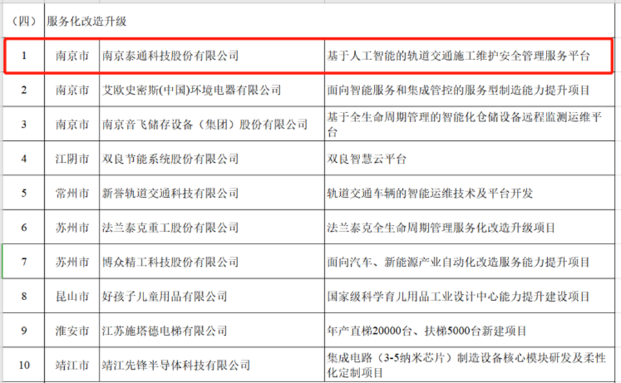 2020年8月14日,南京泰通科技《基于人工智能的軌道交通施工維護(hù)安全管理服務(wù)平臺》成功申報2020年度省級工業(yè)和信息產(chǎn)業(yè)轉(zhuǎn)型升級專項(xiàng)資金(第二批)服務(wù)化改造升級項(xiàng)目。