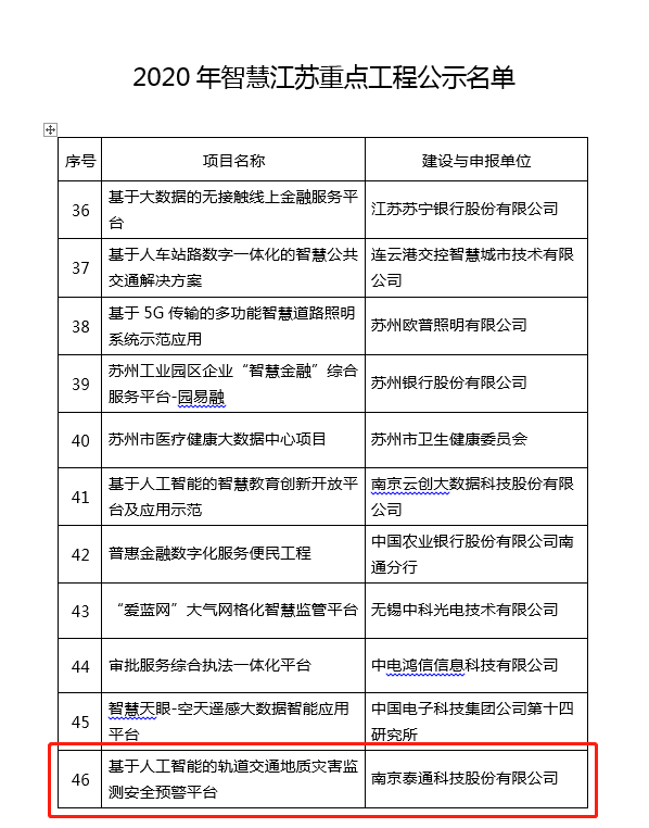 喜訊丨泰通科技《基于人工智能的軌道交通地質(zhì)災害監(jiān)測安全預警平臺項目》上榜2020年智慧江蘇重點工程