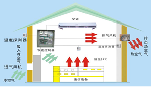 工作原理:智能新風(fēng)系統(tǒng)通過引入室外冷空氣,對(duì)機(jī)房溫度進(jìn)行調(diào)節(jié),當(dāng)室內(nèi)溫度達(dá)到22℃(可設(shè)置),室內(nèi)外溫度差△T≥2℃,智能新風(fēng)啟動(dòng),向室內(nèi)送入過濾后的冷空氣,室內(nèi)溫度降至18℃(可設(shè)置)時(shí),智能新風(fēng)停機(jī),以此循環(huán)工作。